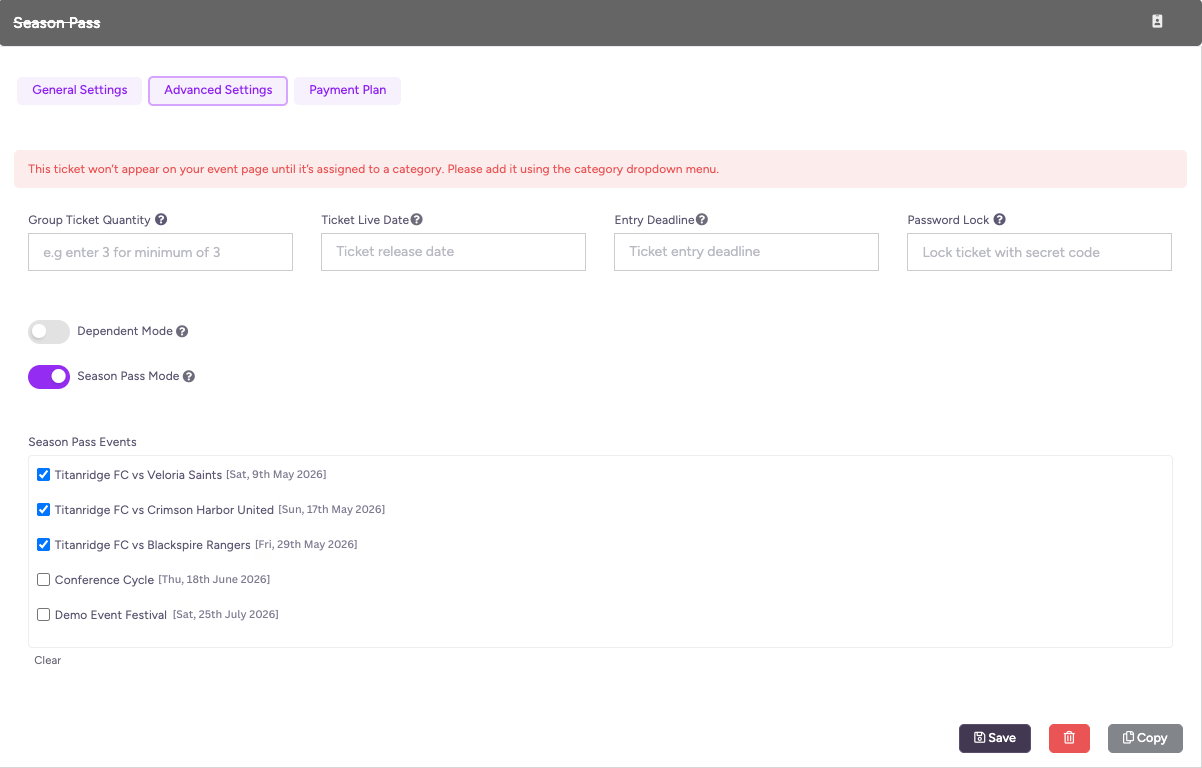 4) Click the Advanced Settings tab and toggle on Season Pass mode, then Select the events where this ticket will grant access.