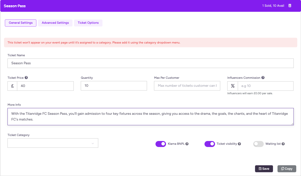 3) Use the more info box to describe the Season Pass and what it entails (e.g season pass gives access to all selected events).